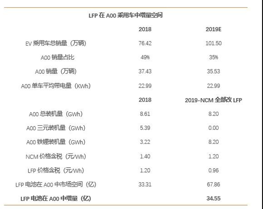 1)2019年A00和PHEV乘用車全部轉(zhuǎn)用磷酸鐵鋰電池;