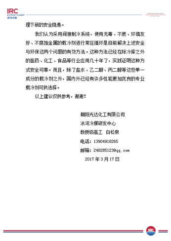 以上是我公司對《設(shè)計(jì)規(guī)范》提出的意見,同時也需要同行們的監(jiān)督和幫助,歡迎廣大冷庫業(yè)主,工程商,上下游企業(yè)來電咨詢冰河冷媒載冷劑制冷系統(tǒng)!